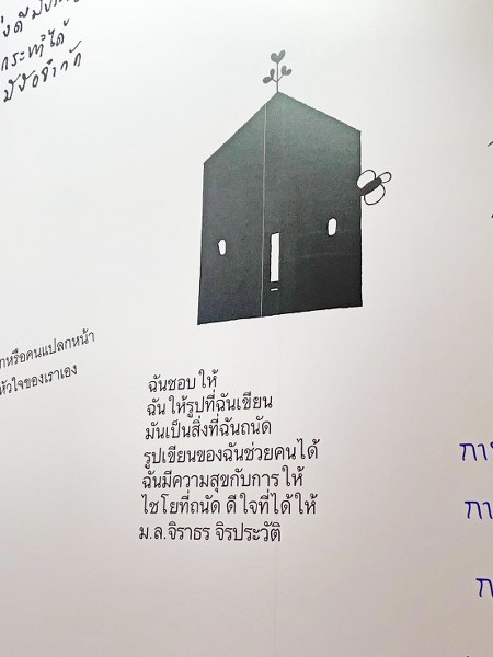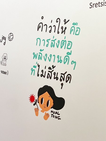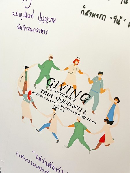 “ครูทำงานกับมูลนิธิรามาธิบดีฯ มาเป็นสิบปีจากความรู้สึกว่า ‘อยากช่วยบ้าง’ แล้วมันก็กลายเป็นความสุขที่ทำต่อเรื่อย ๆ งานของครูยืนอยู่บนความเชื่อว่า ชีวิตที่ดีเริ่มจากการรู้จักตัวเอง ทำในสิ่งที่รัก และใช้สิ่งนั้นช่วยคนอื่นได้ มันคือคุณค่าที่แท้จริงของชีวิต สำหรับครู การให้คือบทเรียนแรกของมนุษย์ เรามีแล้วเราไม่แบ่งปันก็ไม่น่ารัก เวลาเห็นคนใช้ของที่ออกแบบจริง ๆ ไม่ว่าจะเป็นถุงผ้าไม่กี่สิบบาทหรือของใช้เล็ก ๆ น้อย ๆ มันคือความหมายของศิลปะที่เข้าถึงคนทุกกลุ่ม”