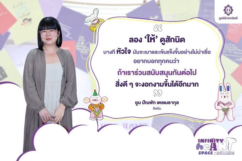“ของที่ระลึกจึงไม่ใช่เพียงสิ่งของหนึ่งชิ้น แต่คือ ‘สื่อกลางของหัวใจ’ ที่เชื่อมโยงหัวใจของผู้คน และพลังบวกจากผู้ให้ไปถึงผู้รับอย่างงดงาม ซึ่งเป็นที่มาของคอนเซ็ปต์ ‘Infinity heART Space’ ของงานในครั้งนี้ เราหวังว่านิทรรศการนี้จะเป็นแรงบันดาลใจให้ทุกคนได้เห็นว่า ‘การให้‘ คือพลังสร้างสรรค์ที่งดงาม และเป็นคุณค่าทางใจที่ไม่สิ้นสุด เพื่อร่วมกันสร้างฐานของการให้ที่แข็งแรงและยั่งยืนต่อไป”