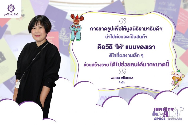 พลอย จริยะเวช กล่าวเสริมถึงการสร้างสรรค์งานว่า “พลอยเริ่มจากการวาดดอกไม้ด้วยหมึกจีน เพราะเชื่อว่าดอกไม้เบ่งบานได้ทุกวัน เหมือนแสงเล็ก ๆ ที่ช่วยให้คนรอบตัวลุกขึ้นมาอีกครั้ง การวาดรูปเพื่อให้มูลนิธิรามาธิบดีฯ นำไปต่อยอดเป็นสินค้าคือวิธี ‘ให้’ แบบของเรา และไม่เคยคิดมาก่อนว่าผลงานเล็ก ๆ จะสร้างรายได้ไปช่วยคนได้มากขนาดนี้ สิ่งที่ประทับใจที่สุดคือ มูลนิธิฯ เลือกผลิตเฉพาะของใช้จริงในชีวิตประจำวัน ซึ่งเป็นสิ่งที่พลอยชอบมาก เพราะมันเป็นของที่ไม่ใช่แค่ของประดับ หรือของที่เอาไปแล้วถูกวางทิ้ง แต่คือเป็นงานที่ใช้ได้จริง และทุกอย่างเกิดจากความตั้งใจของทุกคนที่มาร่วมมือกันเพื่อสานต่อคำว่าให้ไม่สิ้นสุด”