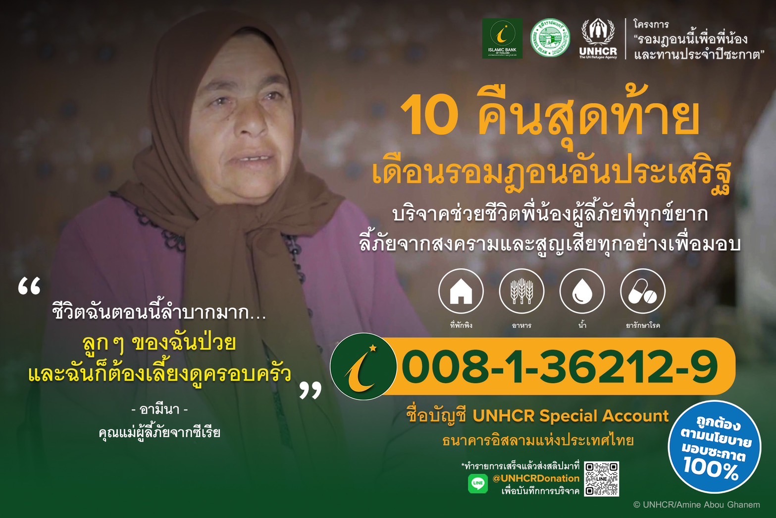 ร่วมบริจาคเพื่อช่วยเหลือผู้ลี้ภัยเพิ่มเติม ผ่านธนาคารอิสลามแห่งประเทศไทย ชื่อบัญชี UNHCR Special Account เลขที่บัญชี 008-1-36212-9 เมื่อโอนเงินบริจาคเรียบร้อยแล้วกรุณาส่งหลักฐานการโอนเงินมาที่ LINE ID: @UNHCRDonation