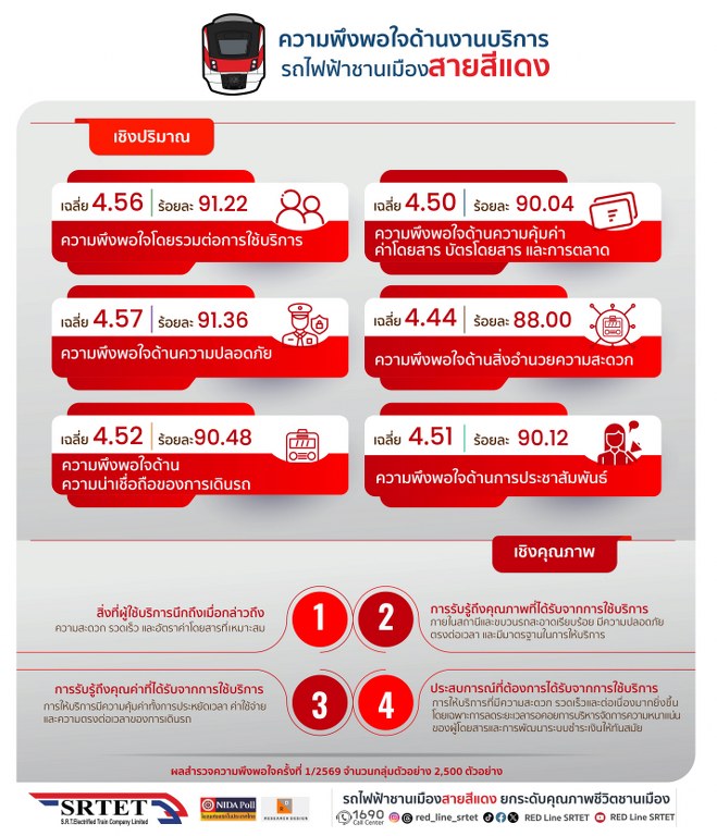 นายสุเทพ พันธุ์เพ็ง กรรมการผู้อำนวยการใหญ่ บริษัท รถไฟฟ้า ร.ฟ.ท. จำกัด (รฟฟท.) ผู้ให้บริการรถไฟฟ้าชานเมืองสายสีแดง เปิดเผยว่า บริษัทฯ ให้ความสำคัญอย่างยิ่งกับความคิดเห็นของผู้ใช้บริการ เนื่องจากเป็นข้อมูลสำคัญในการนำมาปรับปรุงพัฒนาการให้บริการ เพื่อตอบโจทย์ความต้องการของประชาชนให้ได้มากที่สุด โดยการสำรวจความพึงพอใจในครั้งนี้ นับเป็นการสำรวจครั้งที่ 1 ประจำปี 2569 มีการลงพื้นที่สำรวจทั้งในเชิงคุณภาพและเชิงปริมาณ ร่วมจัดทำขึ้นโดยสถาบันบัณฑิตพัฒนบริหารศาสตร์ (นิด้าโพล) ซึ่งเป็นสถาบันที่มีความความเชี่ยวชาญด้านงานวิจัยเชิงคุณภาพมาอย่างยาวนาน และบริษัท รีเสิร์ช ดีไซน์ ซึ่งเป็นหน่วยงานที่มีความเชี่ยวชาญด้านการออกแบบการสำรวจและงานวิจัยเช่นเดียวกัน โดยได้ทำการเก็บข้อมูลจากผู้ใช้บริการในทุกสถานี ผลปรากฏว่า ผู้ใช้บริการมีระดับความพึงพอใจในด้านต่างๆ จากคะแนนเต็ม 5 ดังนี้