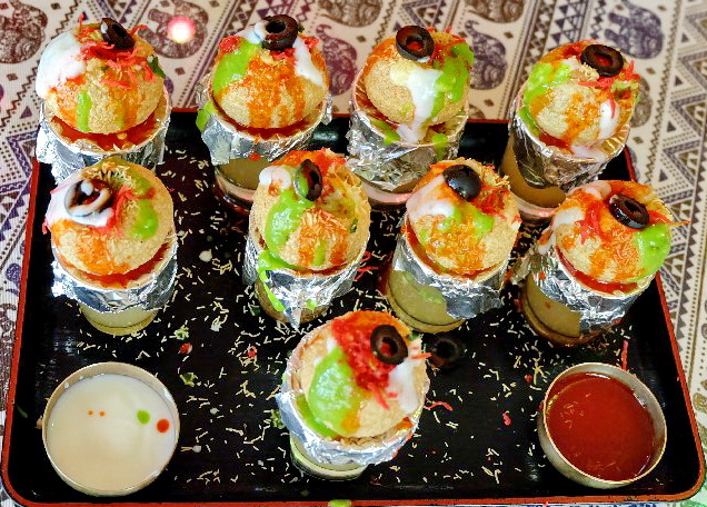 เมนูแรกกับออเดิร์ฟ ปานิ ปูริ PANI PURI ก็เรียบร้อยโรงเรียนอินเดียอย่างดิฉันเลยค่ะ เมนูนี้มีลักษณะเป็นแป้งกลมๆ แบบในตำนานอินเดีย กรุปกรอบนอกนุ่มในด้วยไส้มันฝรั่งและถั่วลูกไก่ มีรูตรงกลางไว้สำหรับเทน้ำซอสลงไป ซึ่งเป็นซอสใสสีเขียว ที่มีรสเปรี้ยวๆของมะขาม และเครื่องเทศพิเศษของอินเดีย รสชาติเปรี้ยวหวานอร่อยกำลังดี ถือเป็นอาหารว่างหรือออเดิร์ฟระดับ 5 ดาวเลยล่ะค่ะ